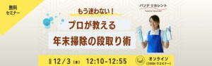 本セミナーでは、限られた時間で効率よく進める“計画の立て方”や、“やる気が続くコツ”、そして“プロが実践する掃除の順番”をわかりやすくお伝えします。